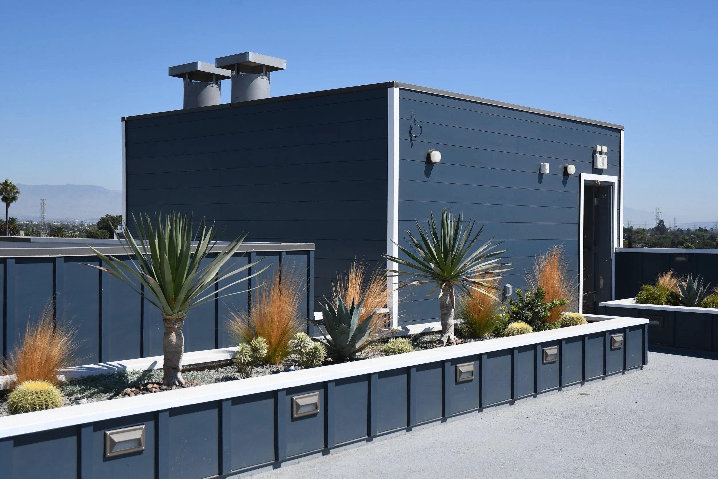 This rooftop blends together rich color, texture and movement in a drought-tolerant design that thrives with minimal care. These vibrant grasses and succulents provide a low maintenance oasis paired with the LA skyline.